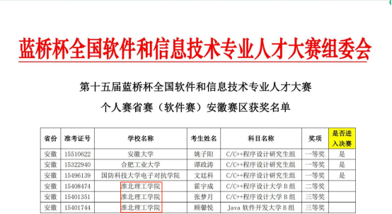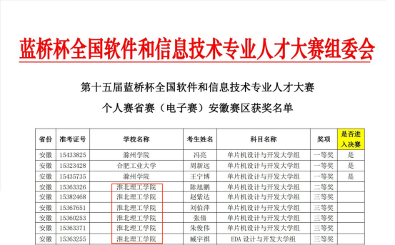 近日,第十五届蓝桥杯全国软件和信息技术专业人才大赛个人赛省赛安徽赛区圆满落幕。万象城awcsport官网首次组织并筛选出17位学子参赛。其中4位参加软件赛的学子荣获省级大学B组二等奖1项和省级大学B组三等奖2项,13位参加电子赛的学子荣获省级大学生组二等奖1项和省级大学组三等奖5项。部分获奖名单如图所示: