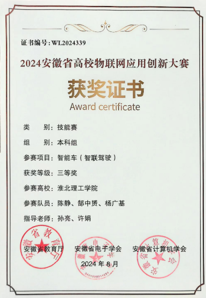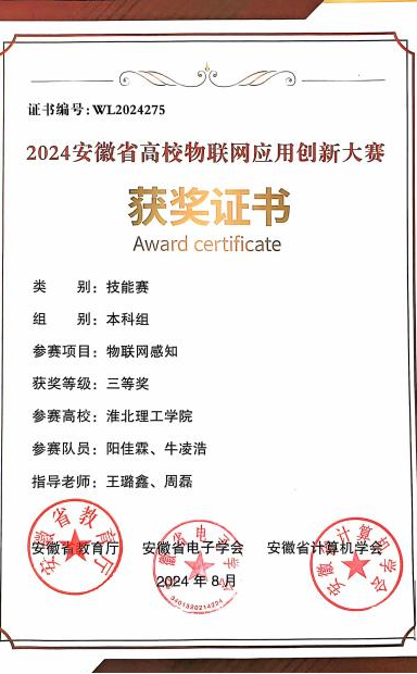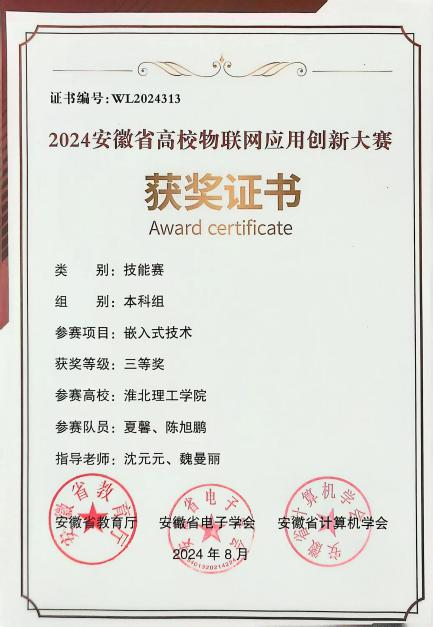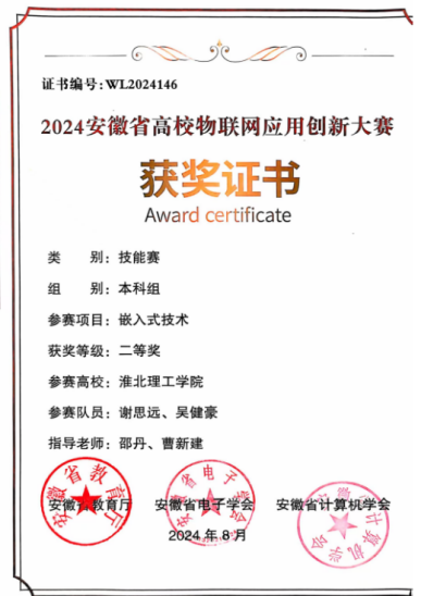 2024年5月11日至18日,我院曹新建、王璐鑫和李硕儒等作为指导老师带领夏馨、陈旭鹏、阳佳霖、孙亚楠等学生参加安徽省高校物联网应用创新大赛,大赛由安徽省教育厅主办、安徽大学和安徽省计算机学会、安徽省电子学会承办,整个比赛过程充分展现了万象城awcsport官网学子较扎实的理论功底、实操能力和良好精神风貌。