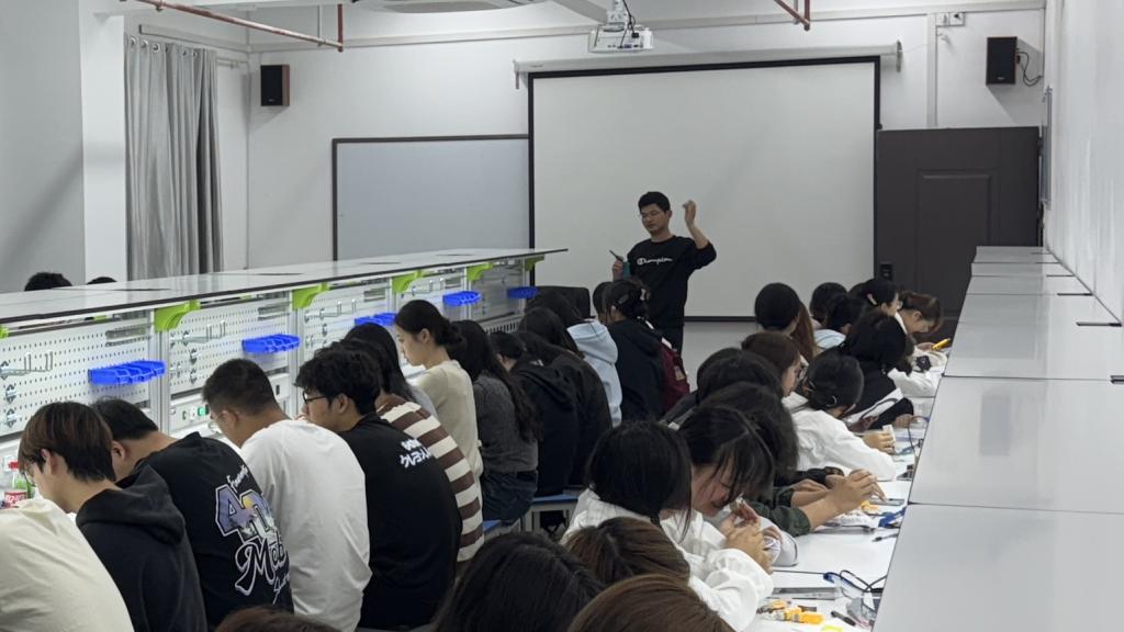 随后,学生们进入循迹小车制作环节。活动采用红色LED作为光源,光线通过地面反射到光敏电阻上,通过检测光敏电阻的阻值变化,判断小车是否行驶在白色区域。经过一个多小时的努力,一辆辆精巧的循迹小车在学生们手中诞生。