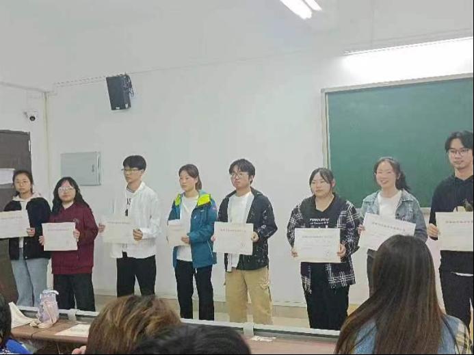 我院上学期举办的普法修德演讲比赛旨在普及法律知识,提高社会法律素养,弘扬社会主义核心价值观,引领人们健康向上的生活方式。比赛中,选手们在激烈角逐中表现出色。由杨雯雯老师为这些同学进行颁奖。