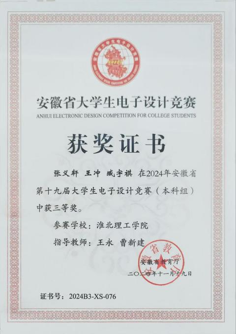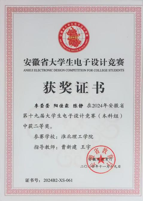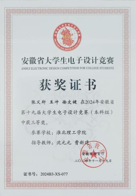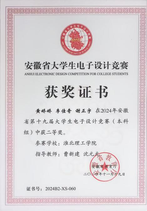 大学生电子设计竞赛题型多样,涵盖电源、信号源、高频无线电、放大器、仪器仪表、数据采集与处理、控制等类别。兼具理论设计与实践制作,在曹新建老师及其他专业师的悉心指导下,参赛队伍历经数月的精心筹备与刻苦钻研,进行了全面而深入的赛前准备。从理论知识的巩固到实践技能的锤炼,每一步都凝聚着师生们的智慧与汗水,确保了参赛队伍以最佳状态迎接安徽省大学生电子设计大赛的挑战最后有4支队伍在此次比赛中取得了优异成绩。